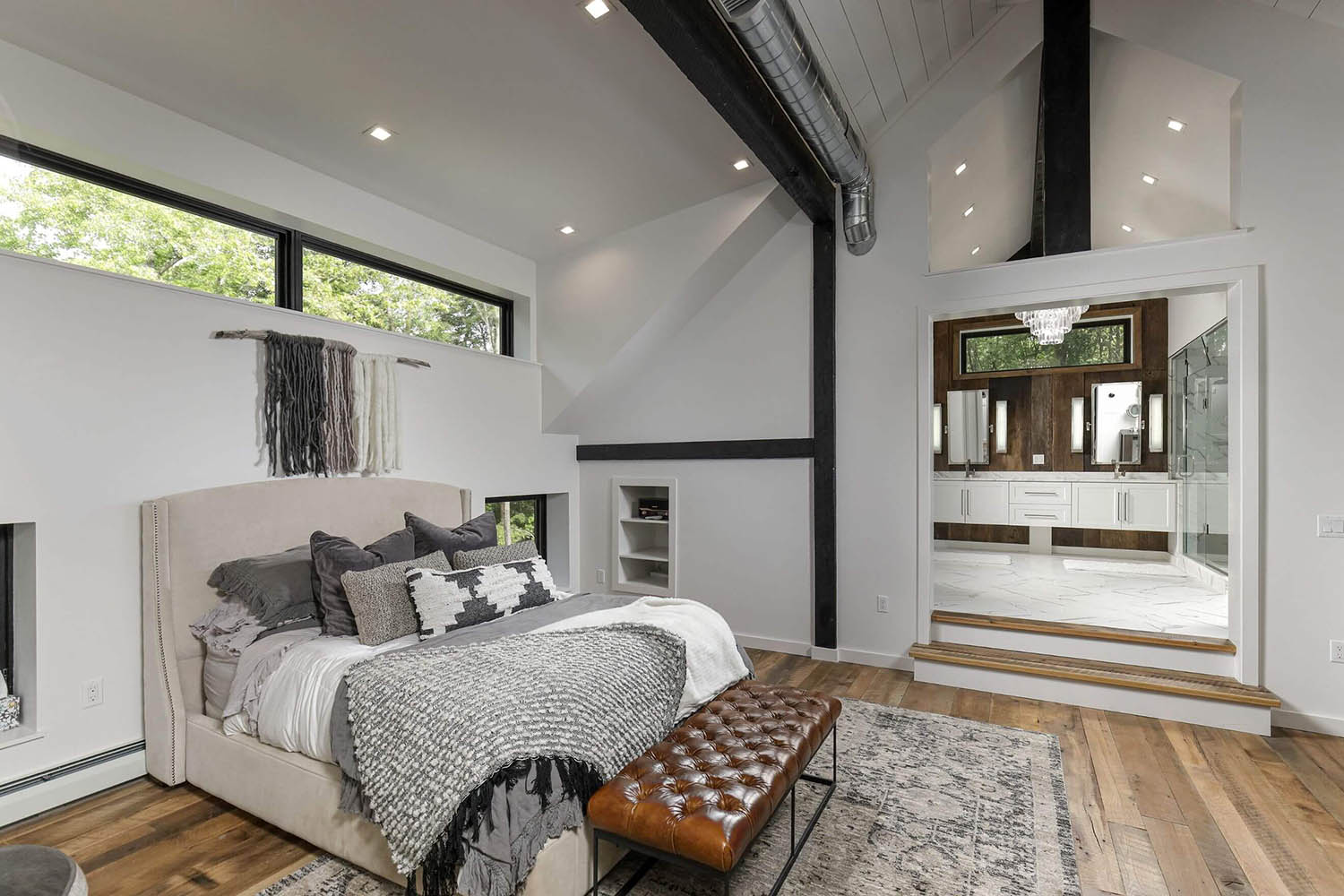 The original post and beam structure was a kit from Yankee Barn. Our client requested the house be designed into a new modern, rustic structure with a new kitchen, master suite, great room, loft, garage and mudroom. Every room of the house would be upgraded to align with the new rustic modern aesthetic. New windows were designed to maximize daylighting and views into the state park. The interior design was intended to express the post and beam structure with a contrast of the modern white walls and steel accents.
